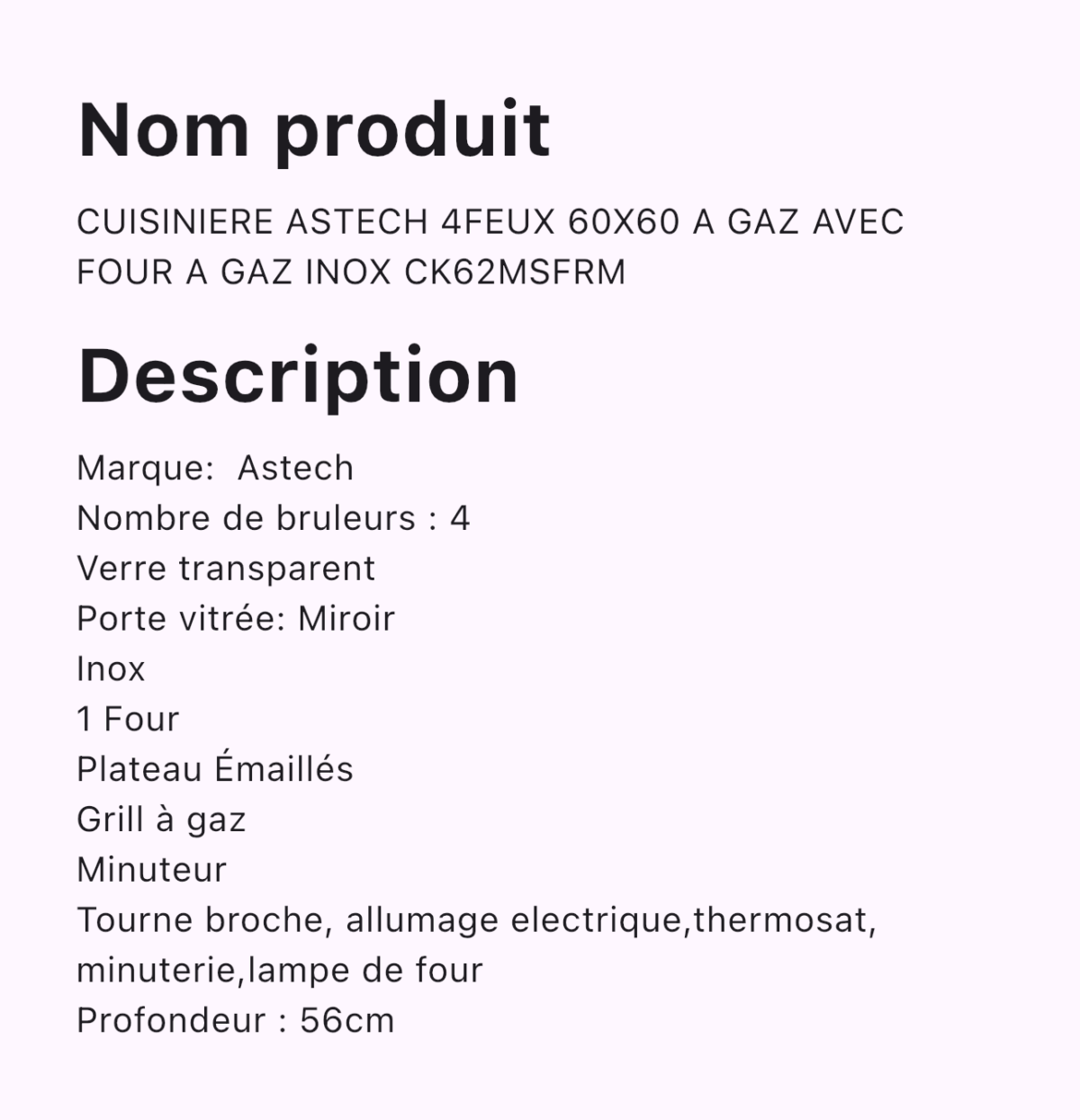 Soyez le premier à laisser votre avis sur “CUISINIERE ASTECH 4FEUX 60X60 A GAZ AVECFOUR A GAZ INOX CK62MSFRM” Annuler la réponse